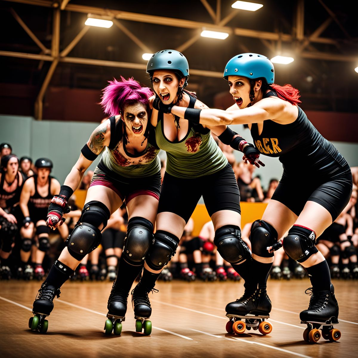 Zombie women playing roller derby, hitting each other, limbs falling off onto roller rink, pushing and shoving, roller skates, frightened audience, intricate details, HDR, beautifully shot, hyperrealistic, sharp focus, 64 megapixels, perfect composition, high contrast, cinematic, atmospheric