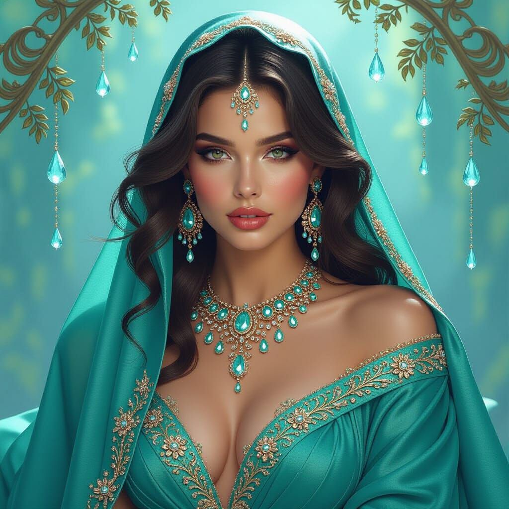 A stunning image of a goddess draped in turquoise silk. The artwork features intricate gold filigree, crystal dew drops, and translucent skin, all rendered in a luminous, maximalist style.