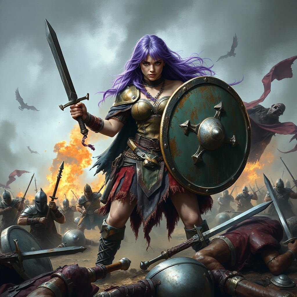 A dramatic image of a fierce shieldmaiden standing on a bloody battlefield, surrounded by the clash of steel and the roar of battle. Inspired by Norse mythology and the works of H.R. Giger, this cinematic scene features detailed brushstrokes and a rich color palette.