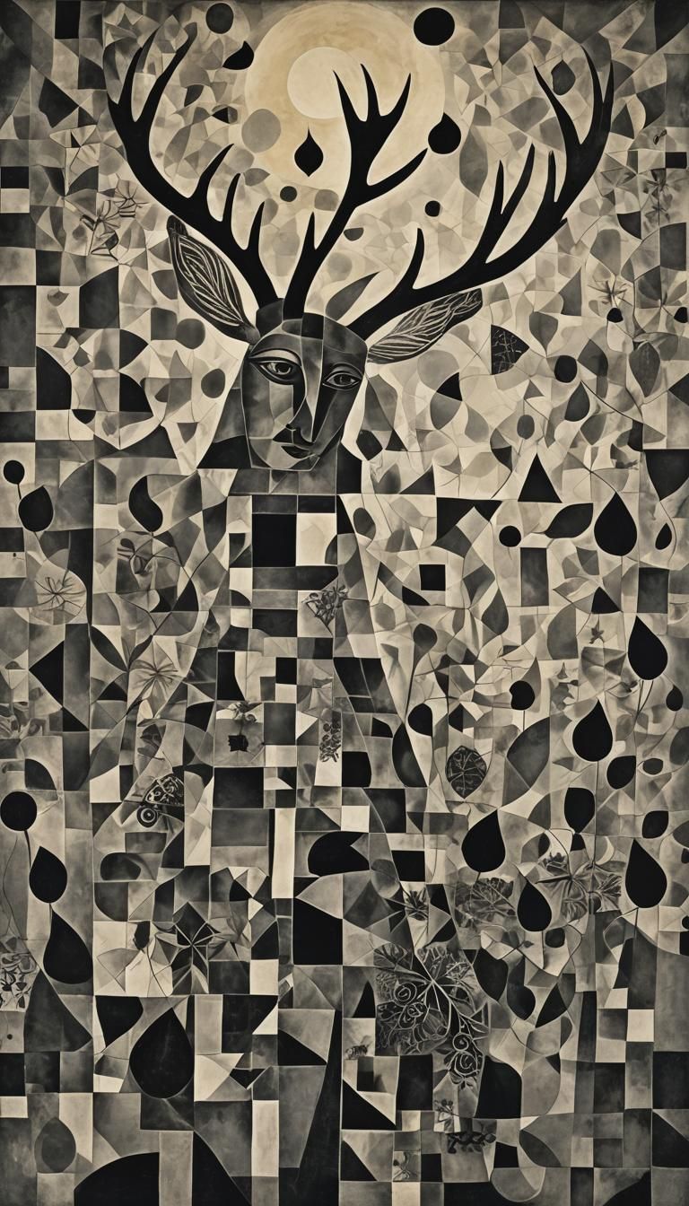 A grayscale image of a fairy-like man with large antlers in a dreamscape. The image features intricate details and a balanced composition in a surrealist style.