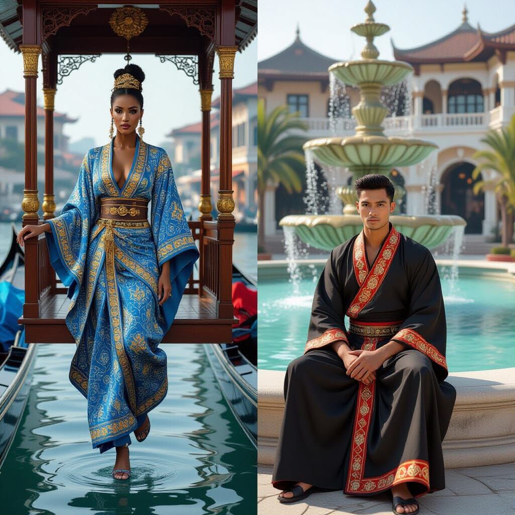 This image shows an African woman in blue and gold Berber robes descending a gondola, contrasted with a Thai man in traditional clothing by a Renaissance fountain. Digital portrait with dynamic lighting.