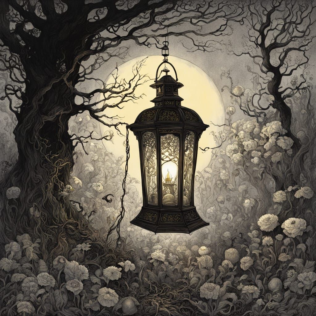 This image shows a double exposure with a lantern illuminating half the scene. Golden zentangle flowers grow on the light side, while withered brambles and a skeletal hand appear on the dark side, in a detailed engraving style.