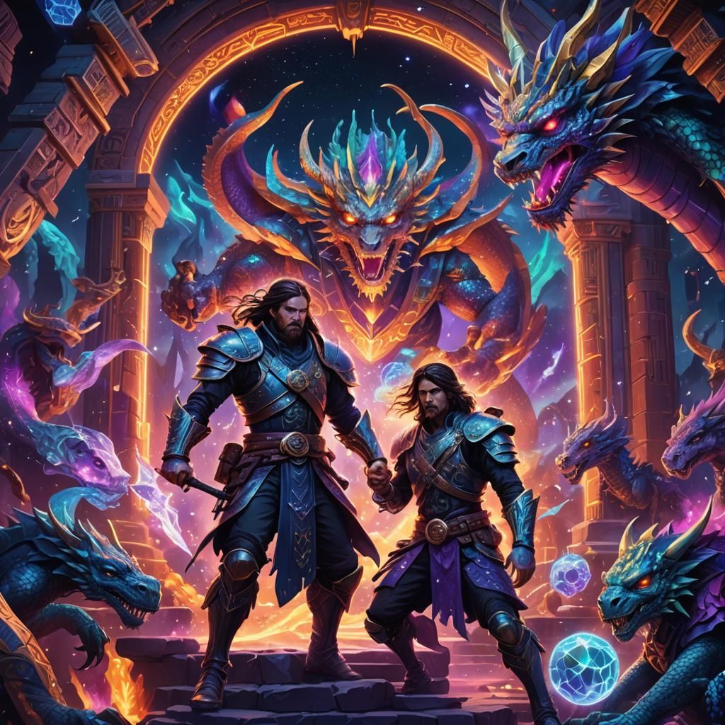 This image shows a cyborg pirate battling dragons inside an ancient temple. The scene features vibrant geometric patterns, iridescent neon lights, fractured crystals, and an otherworldly aurora in a holographic astral cosmic style.