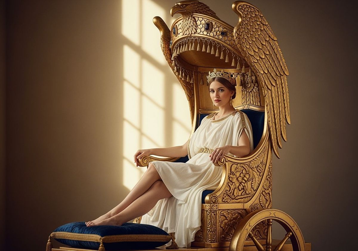 This image shows a serene Roman Empress on her imperial chariot throne. The portrait features luxurious details and soft lighting, reminiscent of high-end professional photography.