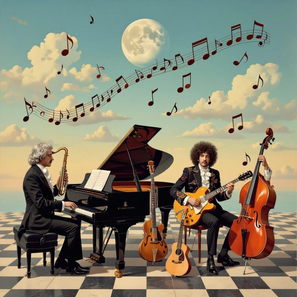 A surreal poster design for a music school featuring a blend of classical and modern musicians. The image is rendered with dreamlike qualities and floating musical instruments.