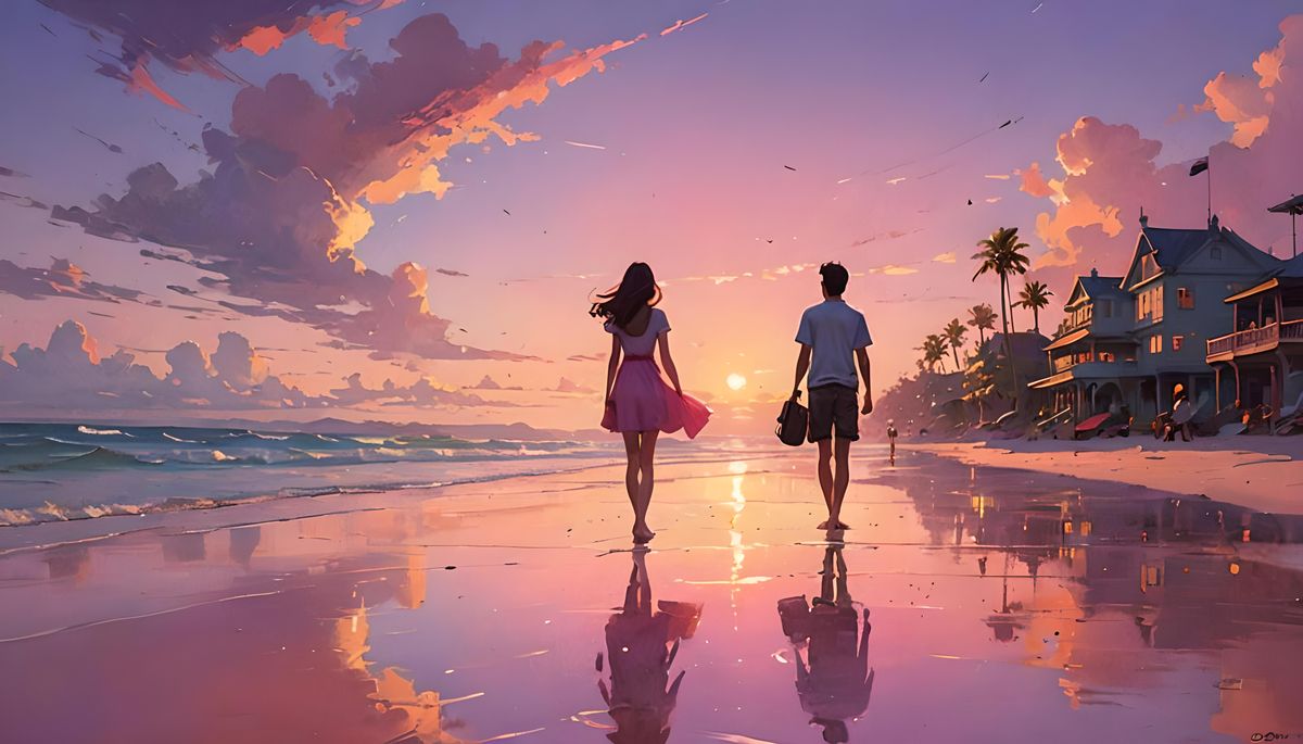 style of guweiz, cory loftis, disney, serene summer beach scene at sunset, The beach is covered in pink sand, and the sky above transitions through vibrant shades of pink, purple, and orange as the sun sets, The calm sea mirrors these spectacular colors, adding a magical and enchanting quality to the ...