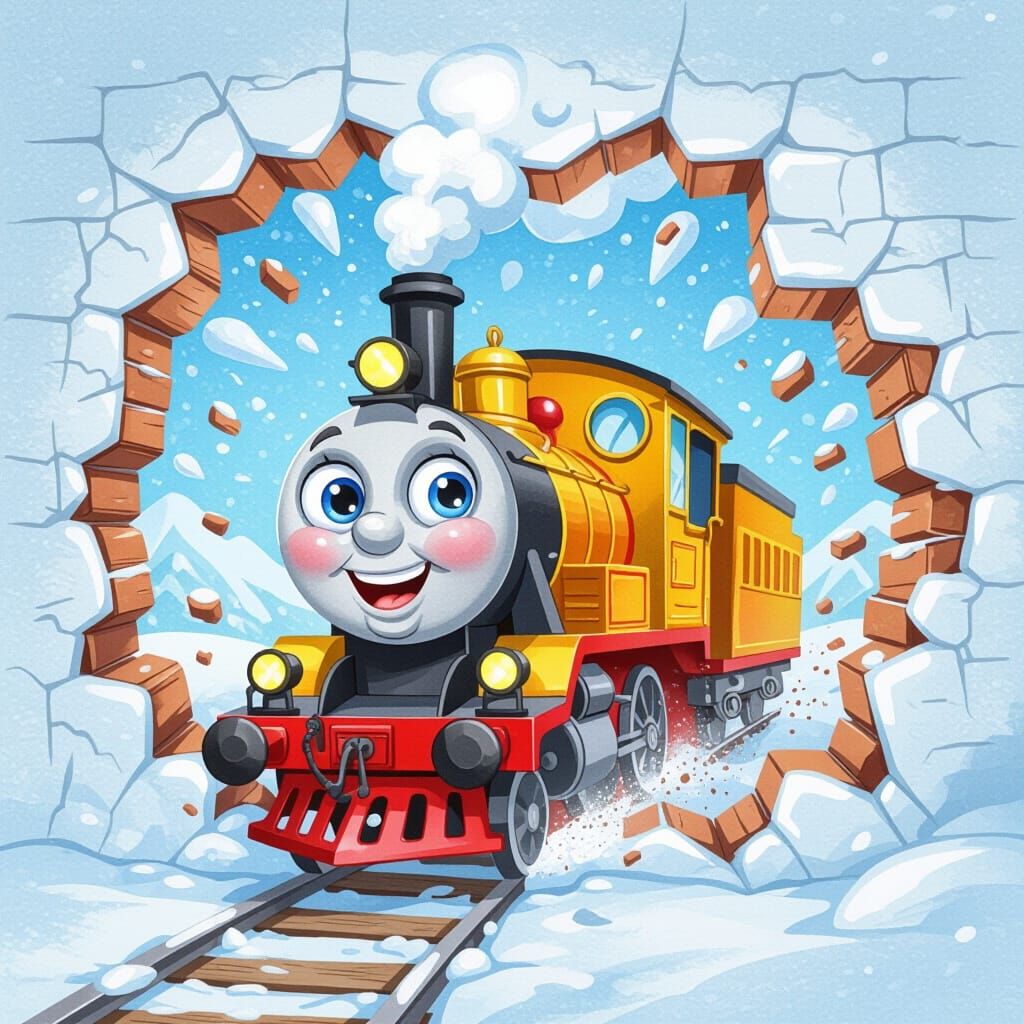 This watercolor illustration features a cheerful cartoon train with large blue eyes, smashing through a snow wall. Flying debris and a bright blue sky with snow add to the dynamic scene.