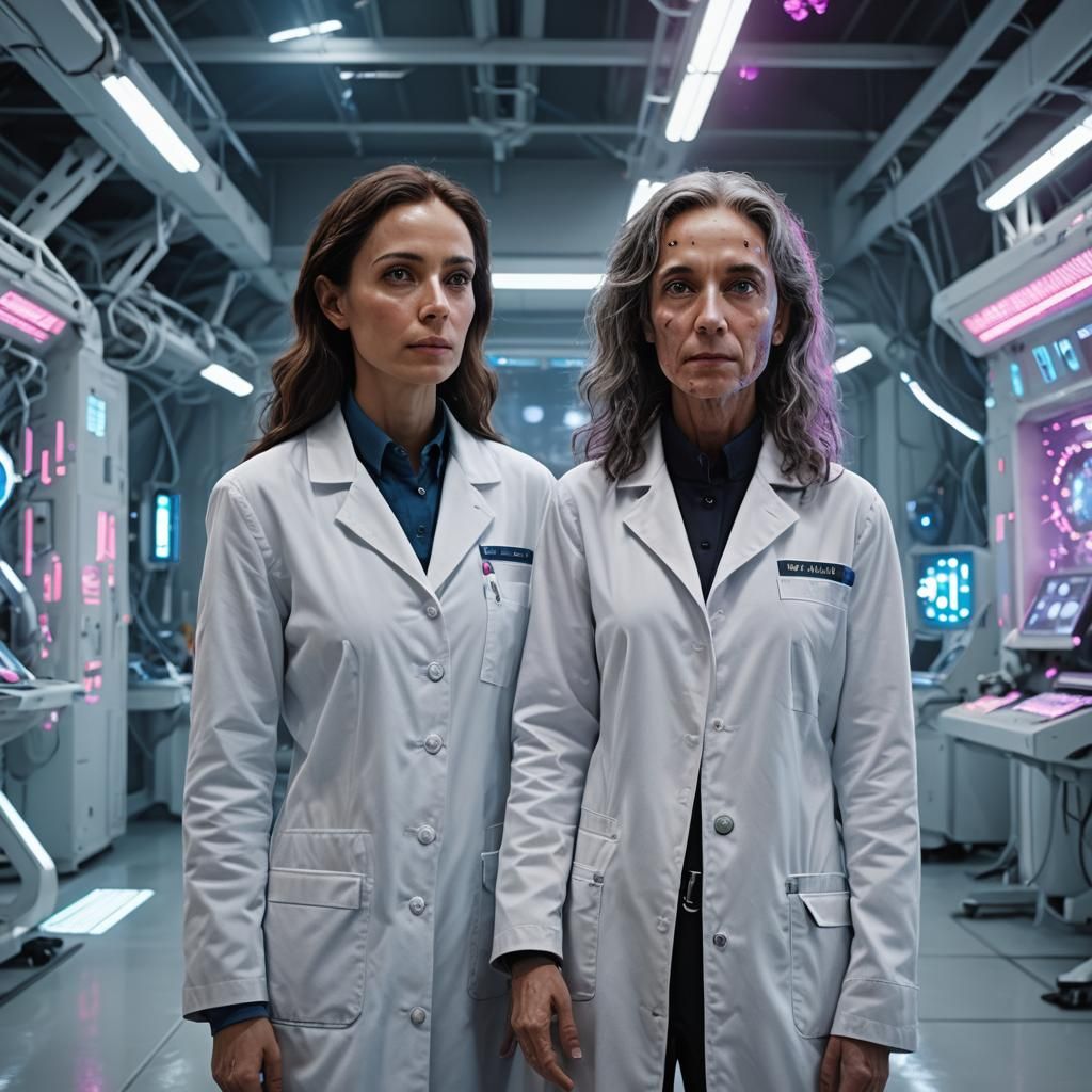 A striking picture of a tall, otherworldly being with blue-grey skin standing beside a scientist in a hangar. The sci-fi art features vibrant colors, bokeh and advanced lighting effects, creating a futuristic atmosphere.