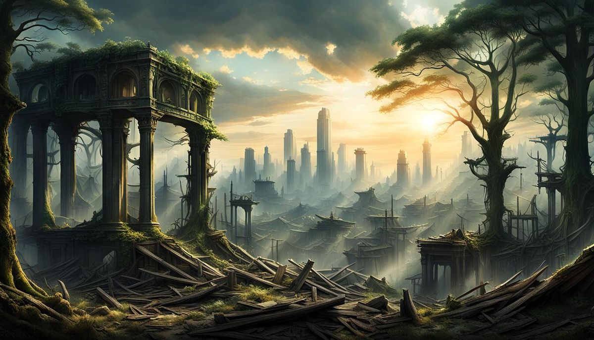 A person gazes toward a ruined metropolis overtaken by a dense forest. Amber sunlight breaks through the hazy sky. This detailed digital matte painting showcases fantastical, intricate post-apocalyptic concept art.