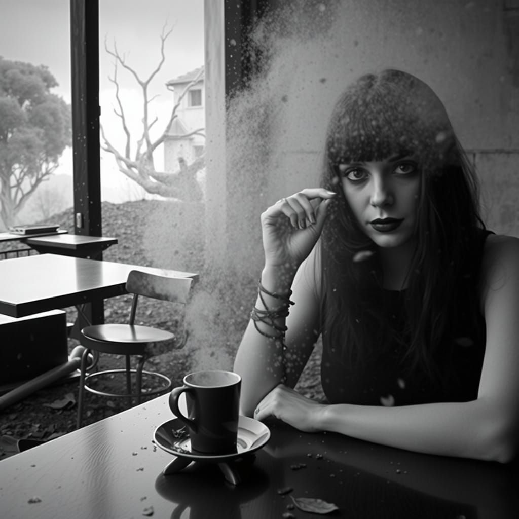 A striking picture of a goth woman in a desolate field with a ruined cottage and dead tree. The image evokes dark romanticism with monochrome lighting and cinematic contrast, in an abstract expressionist style.