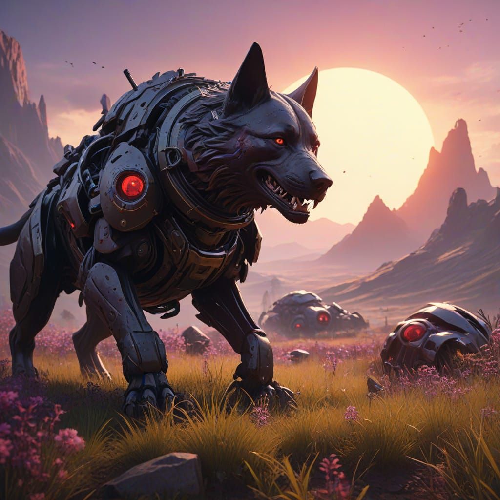 This image depicts a massive, red-eyed death dog standing defiantly in a field of shattered and bloody helmets, illuminated by the eerie glow of a dying sun in a dark fantasy world, characterized by hyper-realistic digital art and vivid, complementary colors.
