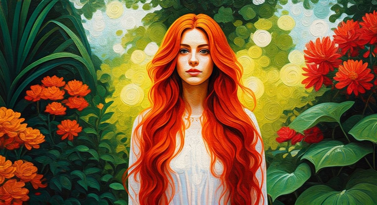 A striking picture of a vibrant woman in a lush garden. The image showcases a post-impressionist aesthetic, with swirling brushstrokes and thick layers of colorful impasto paint.