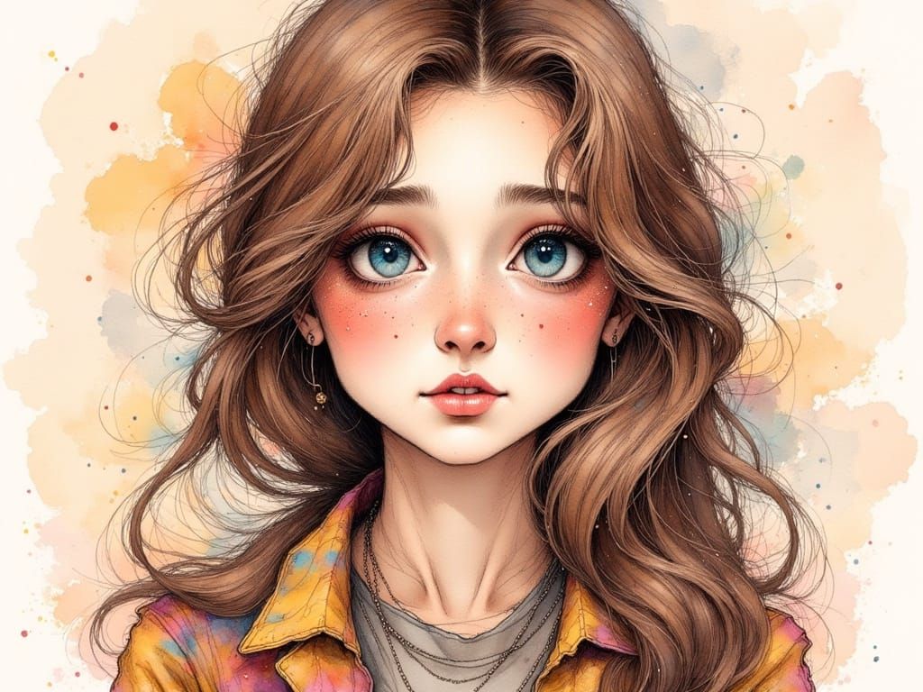 This image shows a beautiful, young woman with brown hair and blue eyes persuasively using puppy eyes on her boyfriend. Rendered with expressive lines, vibrant colors, and emotive details in an ink art style.