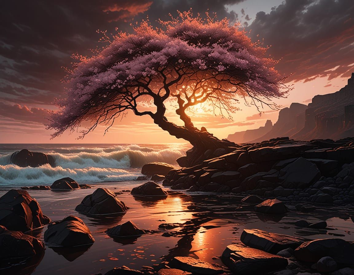 A stunning oil painting of a lone sakura tree standing defiantly in a dark lava landscape, its delicate pink blossoms contrasting with the desolate backdrop, set against a warm golden sunset in a bittersweet scene of solitary beauty