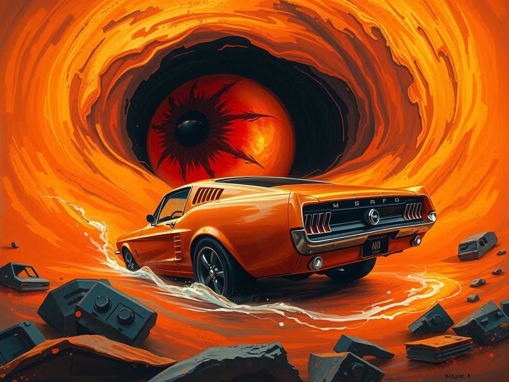 This image depicts a surreal, distorted 1967 orange Mustang caught in a swirling orange fog. A giant glowing eye watches from the mist, rendered in a hard edge painting style with thick, expressive brushstrokes and vibrant colors.