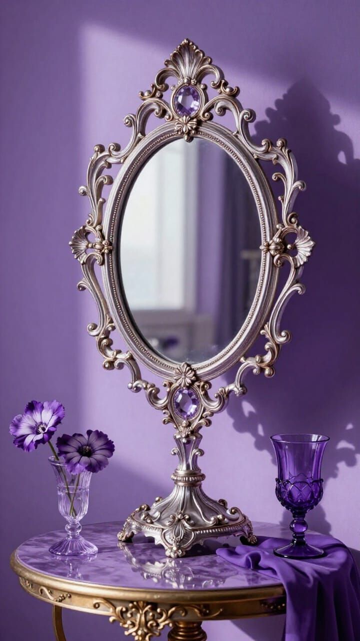 This image features a Baroque-style still life scene dominated by purple hues. It depicts a broken mirror and a withered rose on an ornate table, illuminated by a shaft of light.