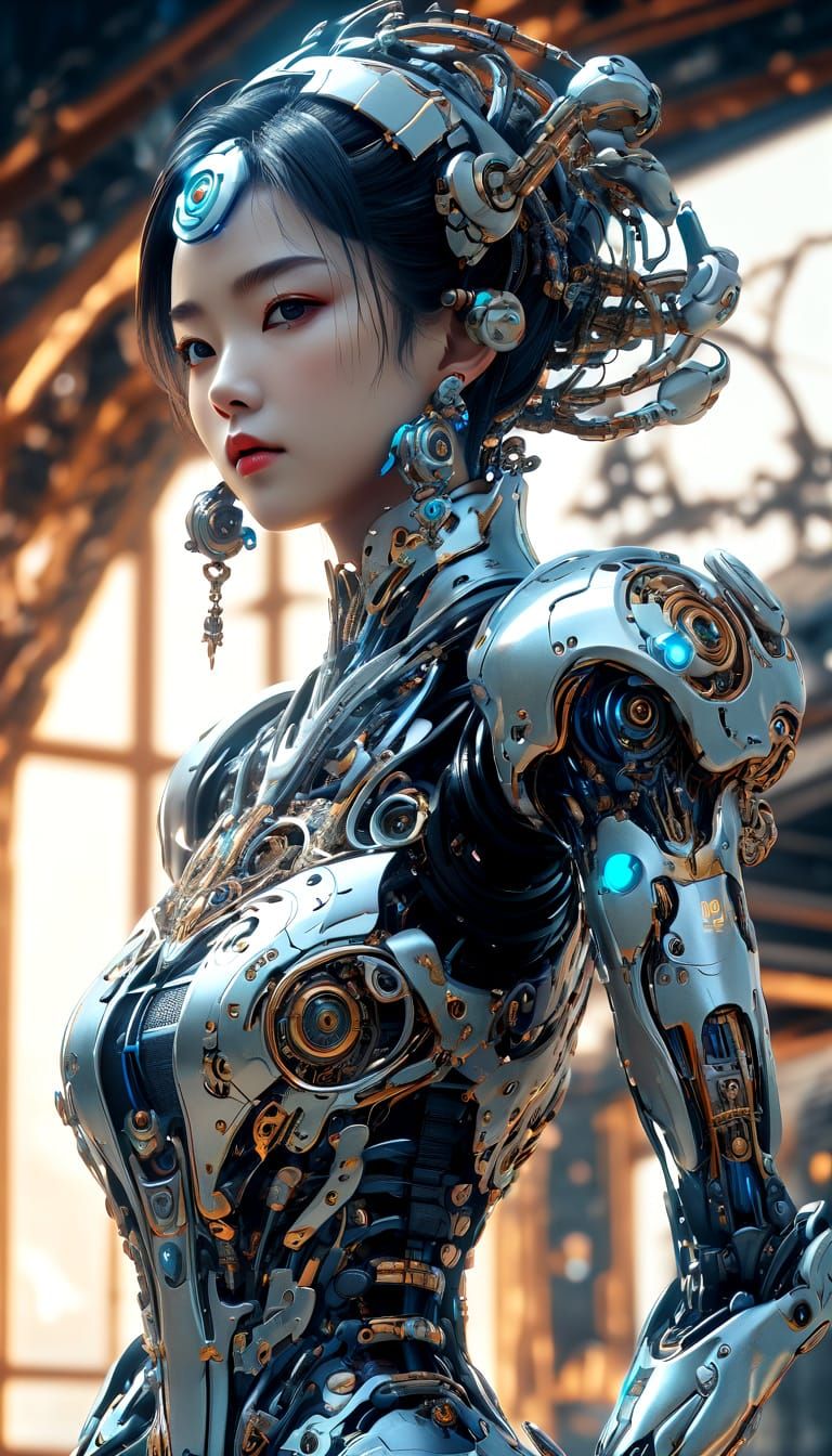 This image shows a beautiful female robot character in a grotesquecore style. The cybernetic wallpaper art features high filigree detail and phad coloration with cinematic lighting.