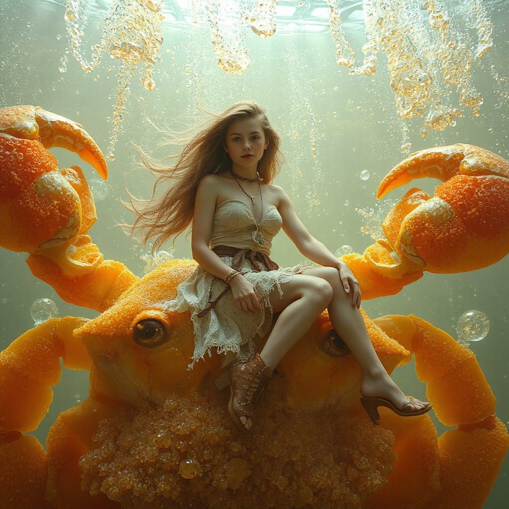 A striking image of a woman in bohemian attire riding a giant gummy crab through a luminous, bubbly soda ocean. The scene features warm amber and tangerine tones with a soft, ethereal glow.