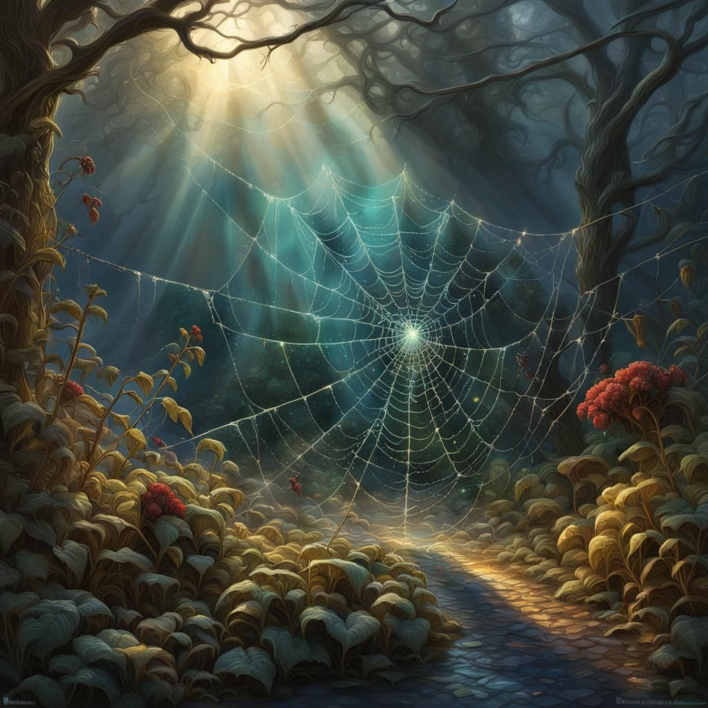 A vibrant image of tangled spiderwebs glistening with morning dew and illuminated by sunbeams. This detailed artwork features deep colors and dynamic lighting in a dark fantasy aesthetic.