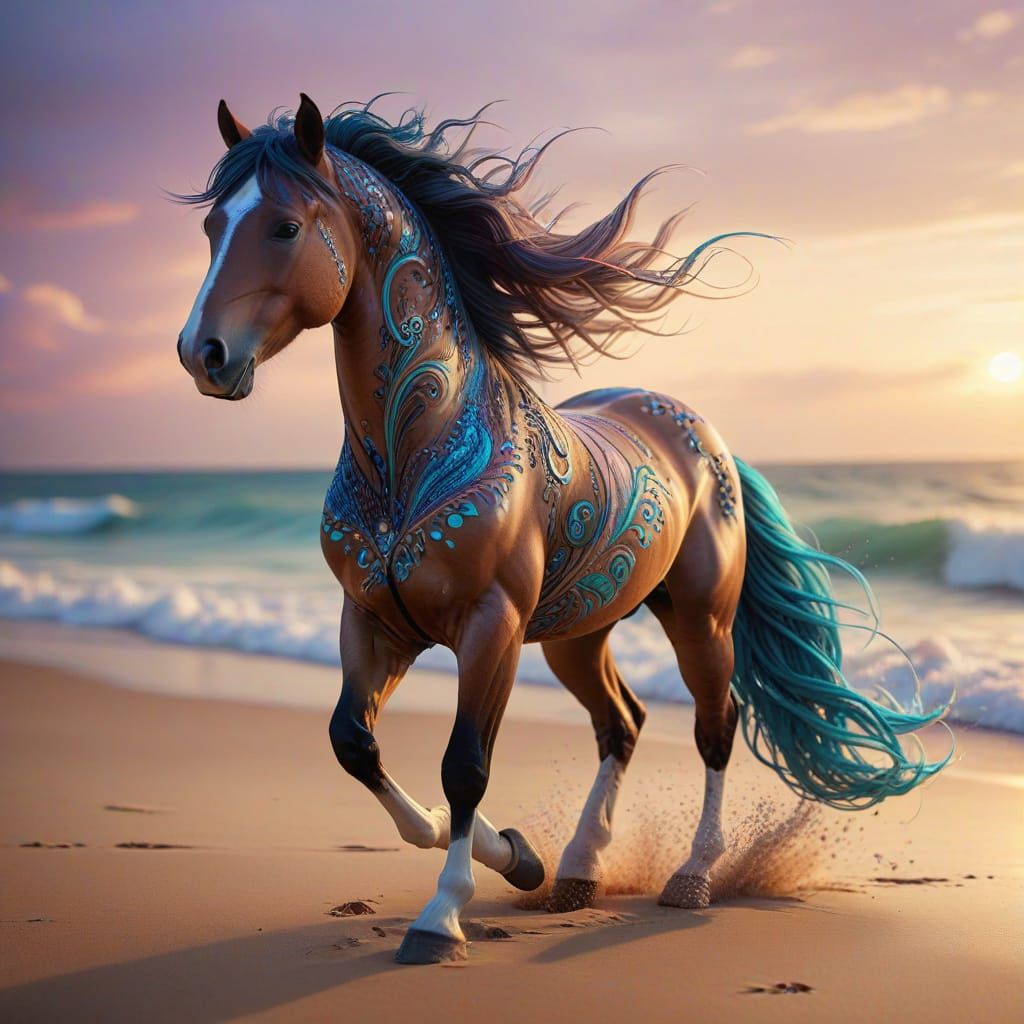 A stunning fractal image of a horse running along the beach at sunset, surrounded by vibrant, swirling blues and intricate Zentangle patterns on its coat, set against a soft, blended sky with warm, golden lighting.