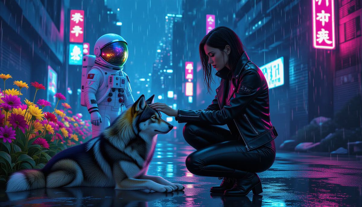 This image shows a sci-fi heroine in a ruined cyberpunk city, petting her wolf companion. The scene features neon lights, dark, gritty textures and futuristic elements in a cyberpunk aesthetic.