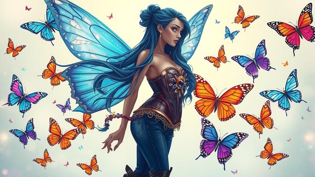 This image shows a fairy with blue hair, a blue corset, blue jeans and black boots. Butterflies of many colors surround her in an ethereal, dreamy scene inspired by whimsical fairy art.