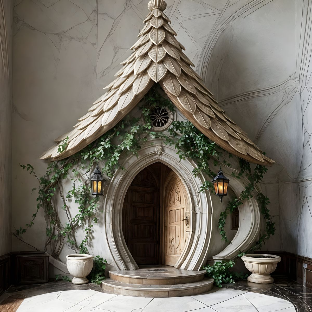 A whimsical birdhouse inspired by Rivendell architecture. The design features marble vines, a tall elvish roof, and leaf shingles, evoking a fantasy aesthetic.