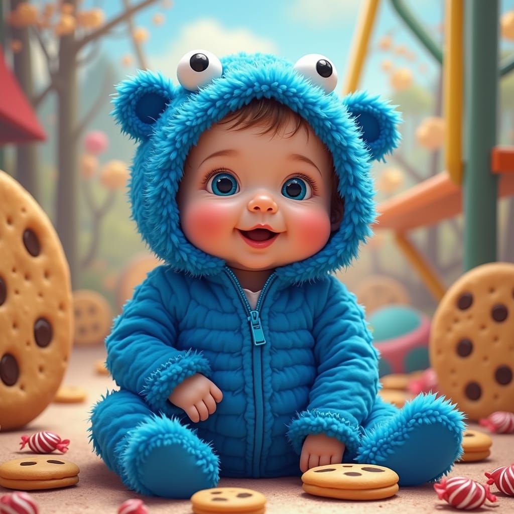 This image depicts a joyful baby dressed as Cookie Monster, surrounded by giant cookies and candy in a vibrant playground setting, reminiscent of classic children's book illustrations with bold lines and textures.