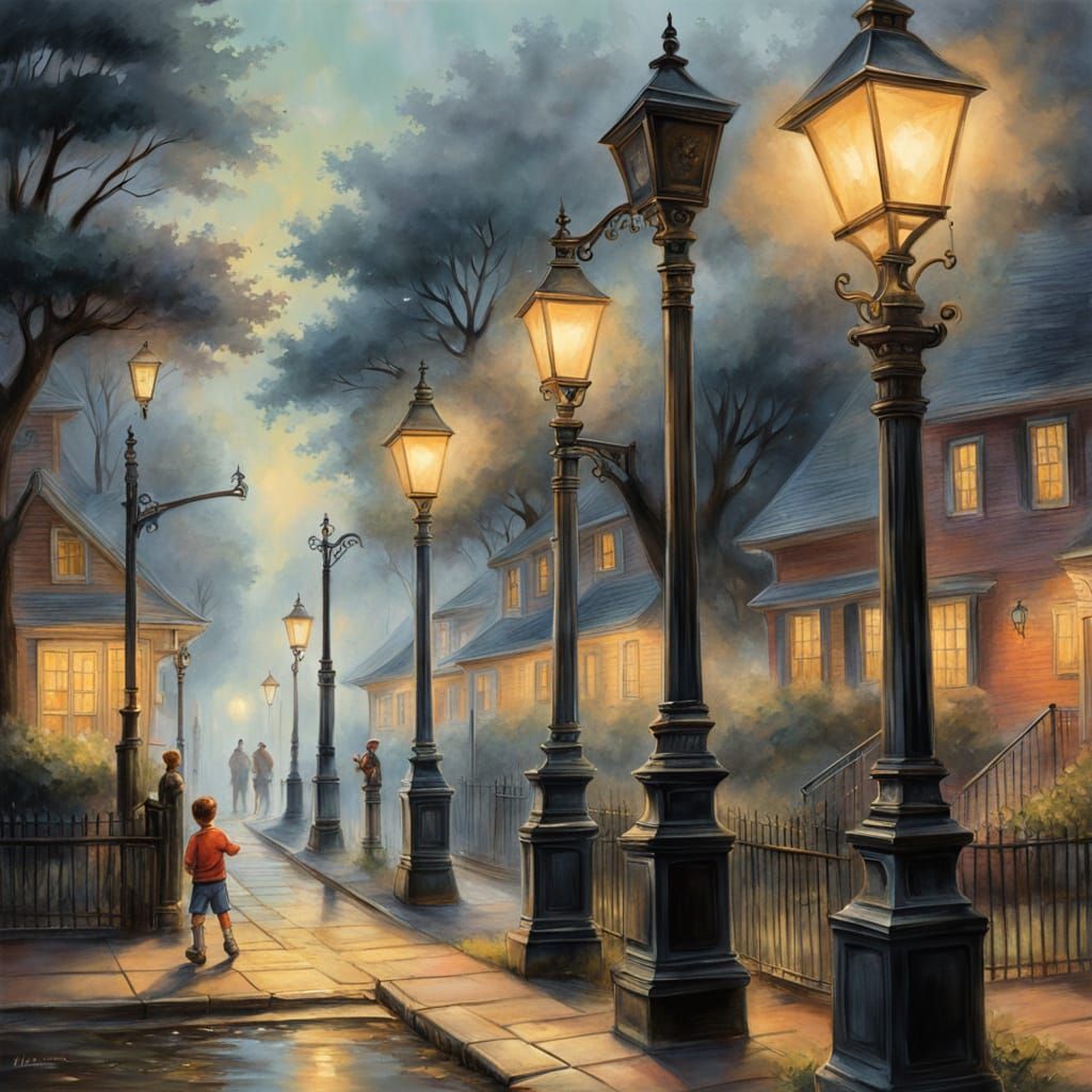 A detailed drawing of children playing under streetlights in a neighborhood square, rendered with soft, warm lighting. The artwork features vibrant brushstrokes and thick textured paint in a neo-impressionistic style.