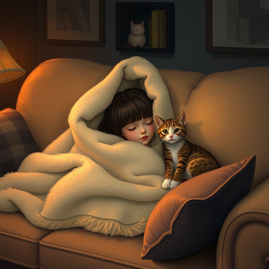 A charming scene of a girl and her cat enjoying a movie night. The cozy illustration style is reminiscent of classic children's book art, with warm lighting and textured details.