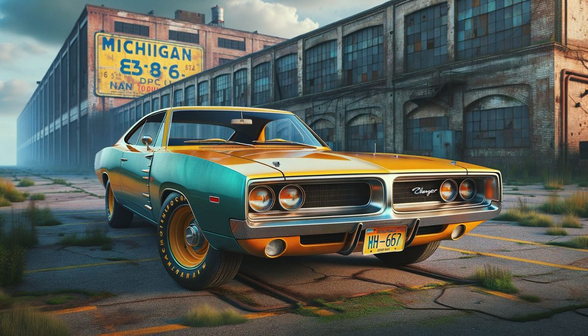 A vintage 1973 Dodge Charger car, painted in a striking combination of yellow and teal....