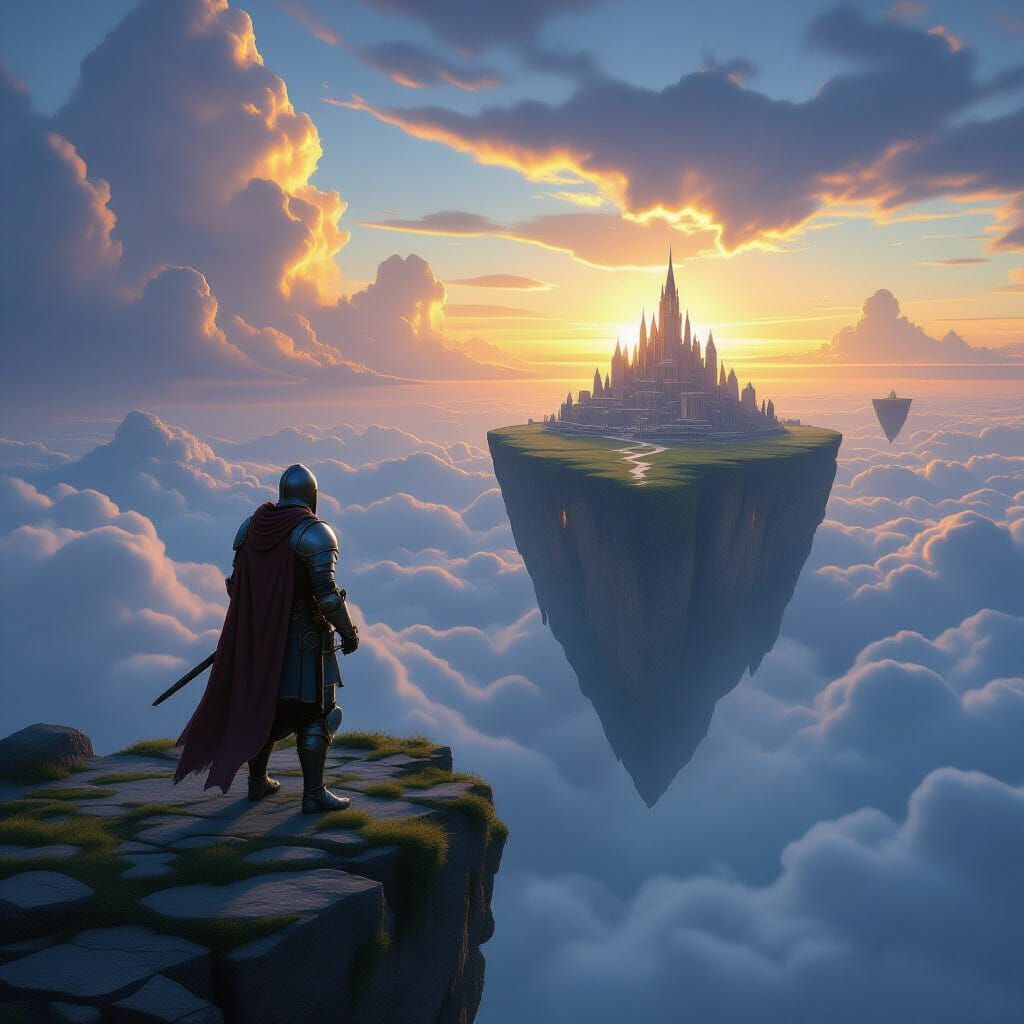 A photorealistic image of a medieval soldier overlooking a vast twilight sky with a city on floating islands. Dramatic lighting highlights the grand vista and the soldier's solitary stance.