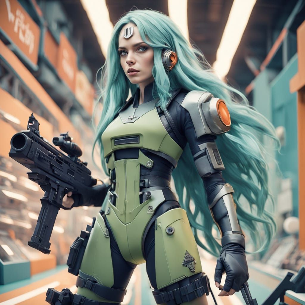 A beautifully crafted, Wes Anderson-inspired image of a striking woman with long green hair and blue eyes, clad in a modern military bikini, firing a rifle in a symmetrical composition with intricate details and a vibrant, saturated color palette.