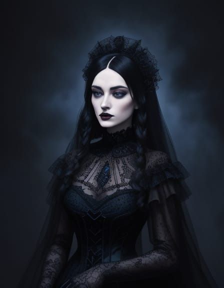 This image captures a mysterious goth woman in a dark, mystical atmosphere, surrounded by intricate lace and velvet, set against a foreboding midnight-blue background with hints of crimson, evoking a dreamlike quality reminiscent of Edgar Allan Poe's eerie essence and Tim Burton's bold lines.