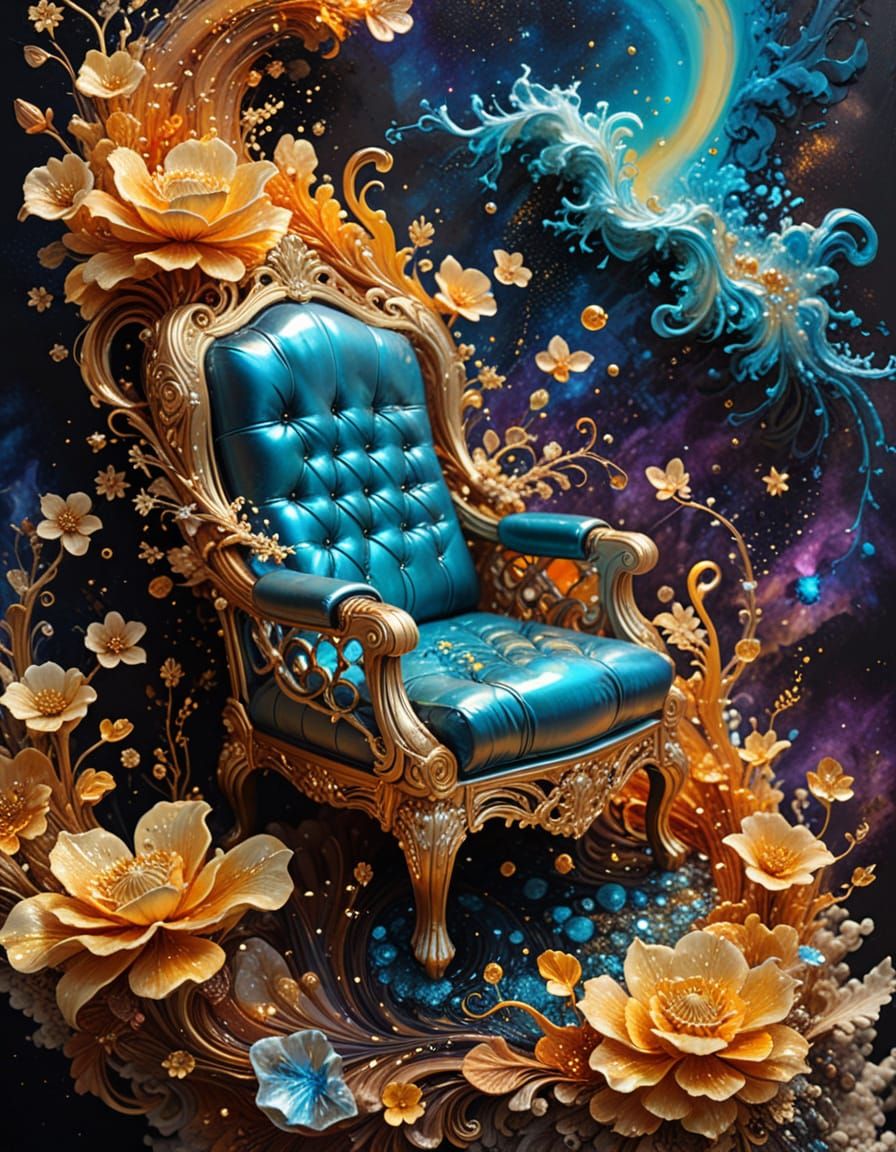 This image shows a surreal armchair sculpted from swirling liquids like soda, ice, and honey, with a lava-like texture. It features intricate golden tendrils and iridescent patterns in a richly textured, dreamlike space setting.