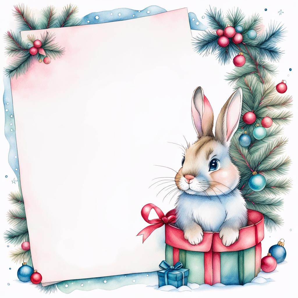 This image shows a cute bunny drawing for coloring on Christmas writing paper. Rendered in a Sarah Kay style with soft contours and thin lines, it features a watercolor effect completely without color.