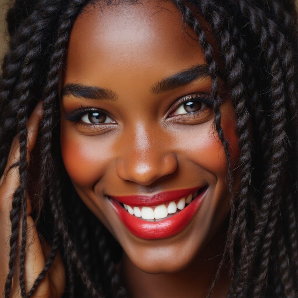 This image features a photorealistic close-up of a smiling African goddess resembling Kelly Rowland, with intricate braided wet hair and mesmerizing blue eyes. Captured in soft studio lighting, inspired by Vogue photography.