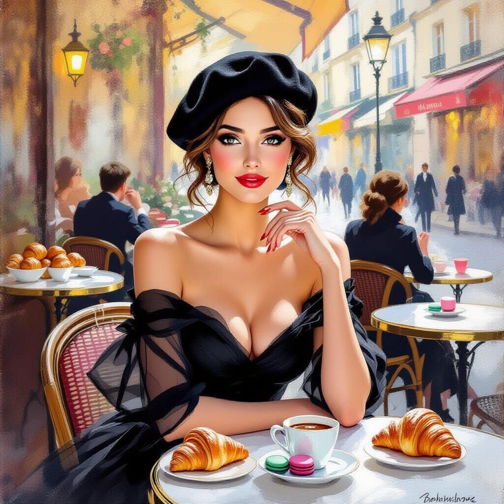 This image depicts an elegant French woman at a charming vintage cafe, with pastries and soft lighting. The style evokes impressionist art with delicate brushstrokes.