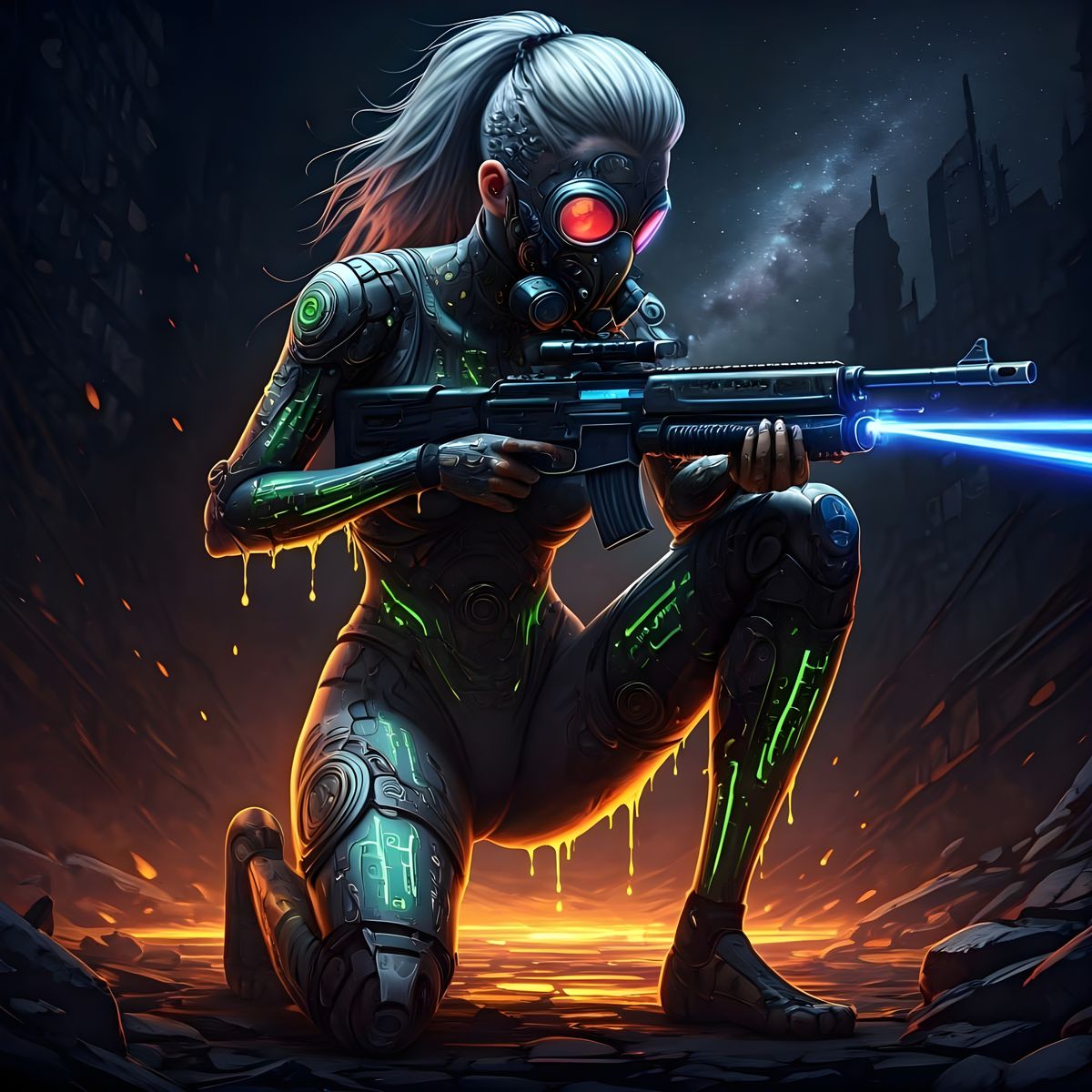 This image shows a technomystical cyborg girl with silver hair and heavy tattoos, set against a ravaged cityscape with a cosmic void. Her form is infused with neon colors and fractal patterns, with glowing circuitry and metallic accents blending into vibrant tendrils.