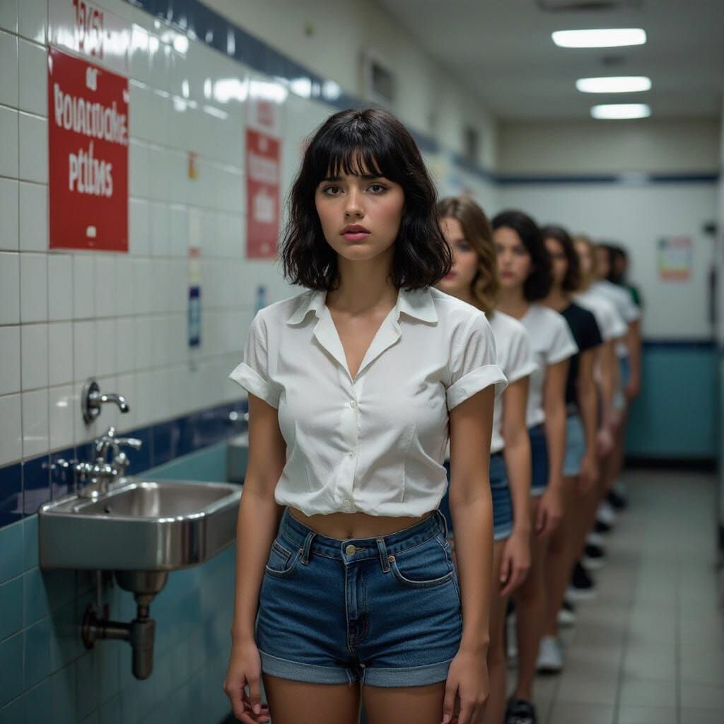 This image shows a young woman with black hair and a white shirt, wearing blue shorts, in a desperate pose. She stands in a long line for a public restroom, rendered with dramatic lighting and vibrant textures in a film noir style.