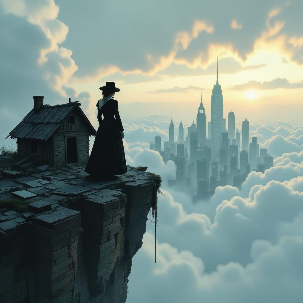 This image shows a lone figure on a decaying shanty atop a floating island, overlooking a futuristic city through clouds. It's depicted in a dramatic German Expressionist style with stark contrasts and distorted perspectives.