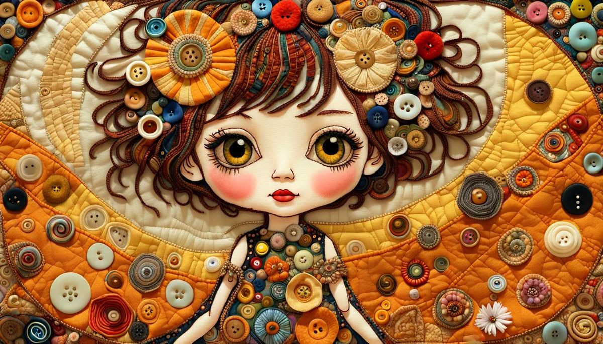 A mixed media quilt of a chibi moppet figure. The image uses a rich array of fabrics, dried flowers, buttons, shells, and jewelry to create complex textures and depth.