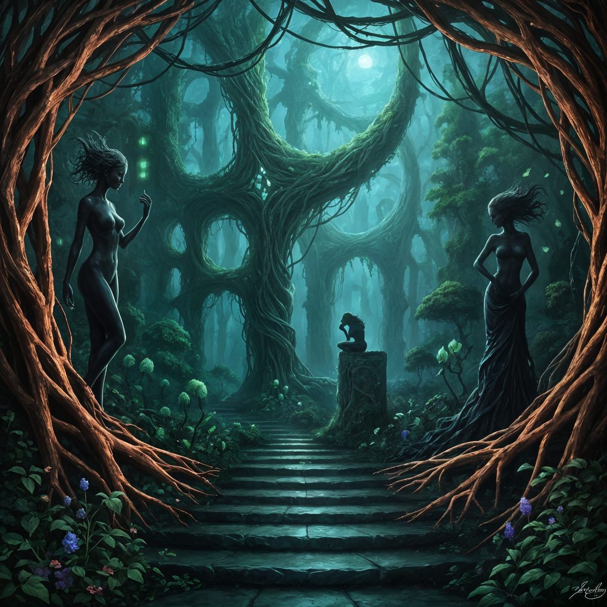 This oil painting depicts a magical garden at twilight, featuring bioluminescent plants, impossible organic architecture, and pools of shadow and moonlight. Ethereal feminine figures display inhuman grace within the grand, melancholic scene.