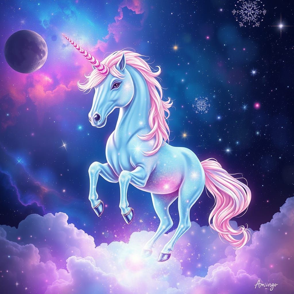 This image depicts a majestic unicorn amidst swirling cosmic patterns, created in a vibrant holographic style with mixed media techniques, evoking a sense of ethereal wonder.