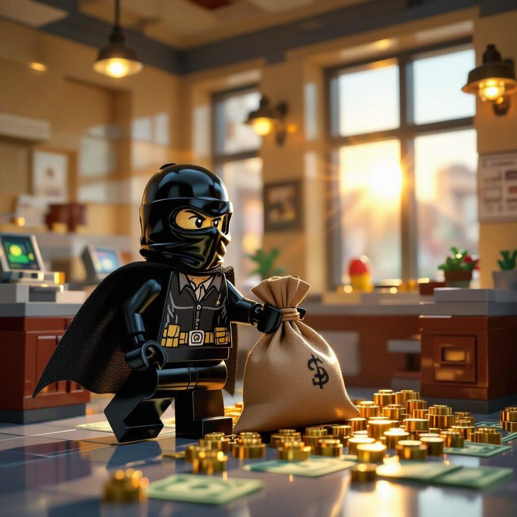 This image depicts a classic Lego minifigure villain robbing a bank. The scene features a bright, colorful Lego aesthetic with dynamic lighting and golden hour light, reminiscent of stop-motion animation.