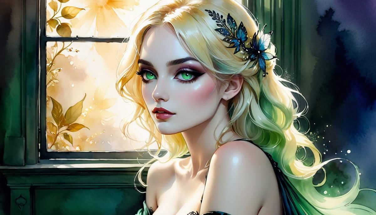 This image shows a young blonde goth necromancer in a Paris brothel, rendered in an ink and watercolor style with ethereal, sensual lighting.