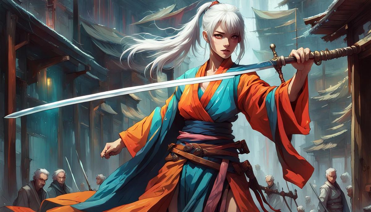 A detailed digital artwork of an anime girl with white hair in a ponytail, wielding a sword and wearing a colorful robe. The image showcases intricate details and a fantasy aesthetic.