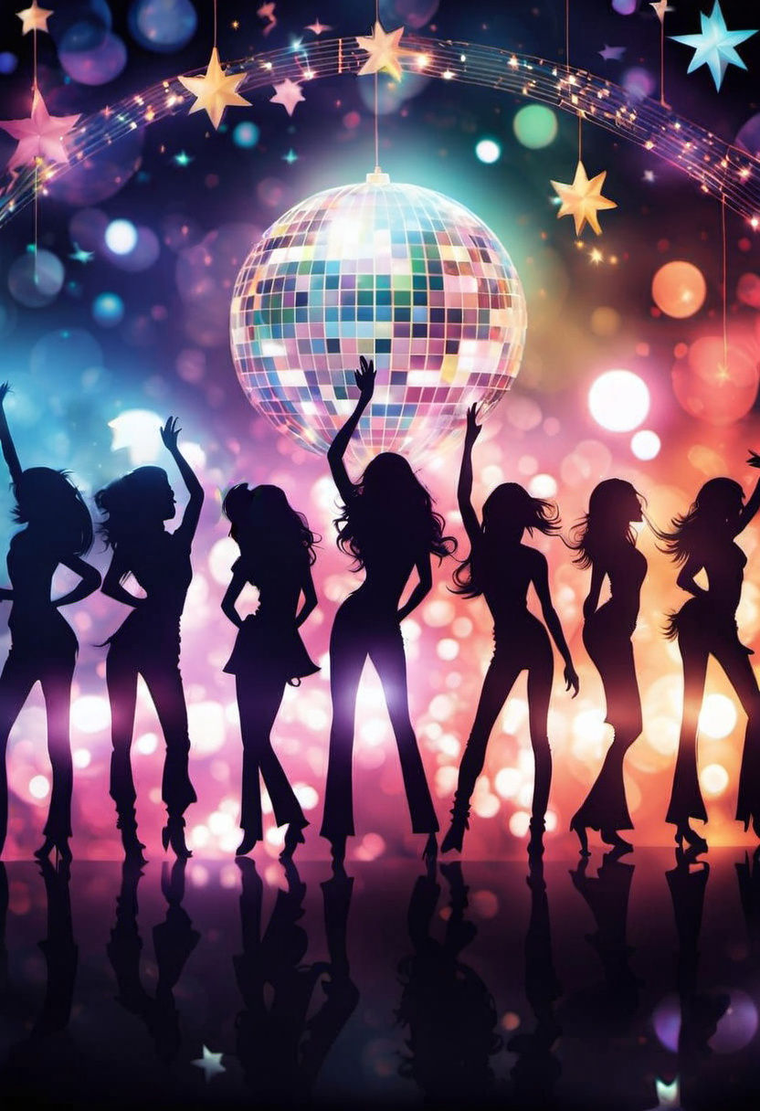 This image showcases a colorful disco party scene with Vargas-style female gogo dancers in silhouette, surrounded by shooting stars, a disco ball, and funky guests. The scene is rendered in a bokeh style with a focus on glamorous hairstyles and disco-inspired fashion.