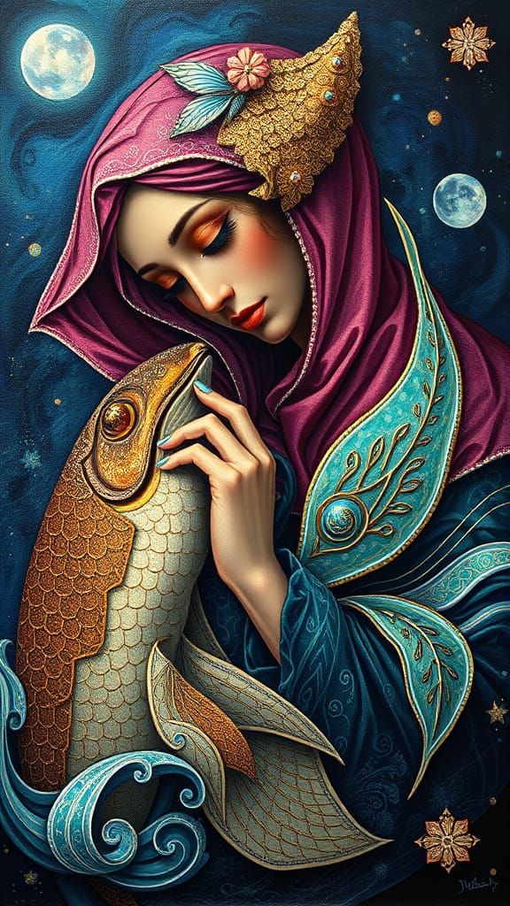 Selkie Seamstress Ribbon Moebius contrasting colors deep color art deco poster art psychedelic art qajar art brocade impasto filigree faience majolica quilling oil on canvas 3D shading beautiful complex elegant iridescent intricate hyperdetailed holographic serene Male Men