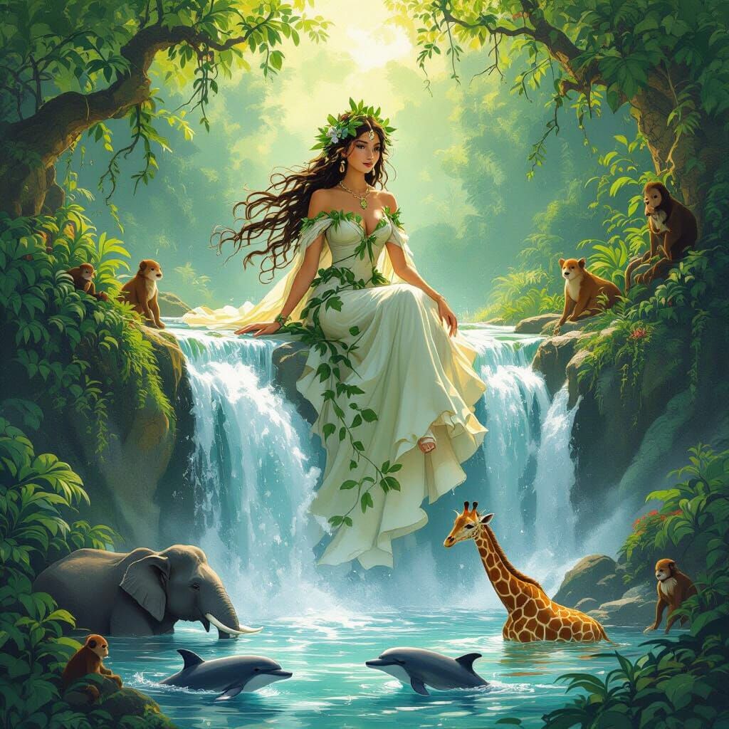 A vibrant image showing a woman as a nature queen. She is adorned with natural elements and sits above a waterfall, surrounded by a jungle teeming with diverse wildlife in a fantasy art style.